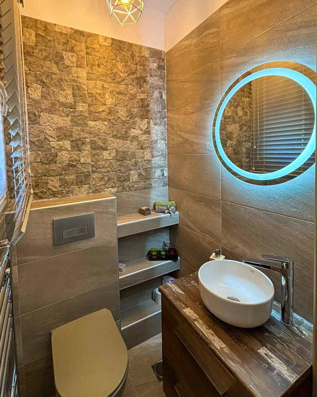 Η σύνθεση βασίζεται σε μεγάλα stone-look πλακάκια σε ζεστούς τόνους, με έναν accent τοίχο σε υφή “πέτρας” που δίνει βάθος στον χώρο. Στον νιπτήρα, ο επικαθήμενος κεραμικός νιπτήρας συνδυάζεται με μπαταρία νιπτήρα σε χρωμέ φινίρισμα και ξύλινο/wood-look πάγκο, ενώ ο στρογγυλός LED καθρέφτης προσθέτει καθαρό φωτισμό και αίσθηση μεγαλύτερου χώρου. Στη ζώνη WC, η λεκάνη με καζανάκι εντοιχισμού και πλακέτα χειρισμού κρατά τις γραμμές minimal, με επιπλέον αποθηκευτικούς χώρους/ράφια για πρακτικότητα.