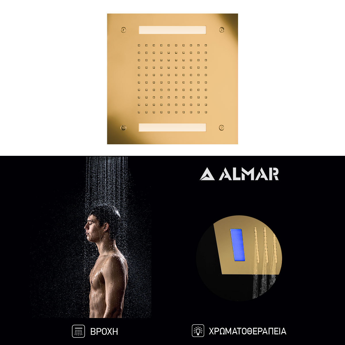 Κεφαλή Ντουζ Εντοιχισμού Οροφής 30x30 με Χρωματοθεραπεία, Almar PVD Brushed Gold
