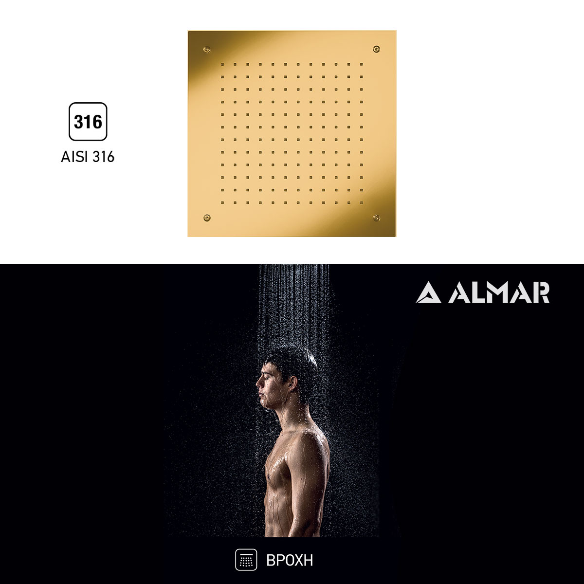 Κεφαλή ντους οροφής εντοιχισμού Temptation τετράγωνη 38x38 εκ. από ανοξείδωτο ατσάλι AISI316, Almar Ιταλίας